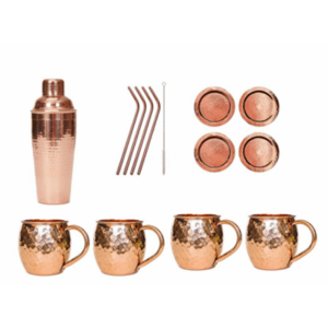 All-in-One Party Set: Includes 4 mugs, 1 cocktail shaker, 4 coasters, 4 copper straws, and 1 cleaning brush.
